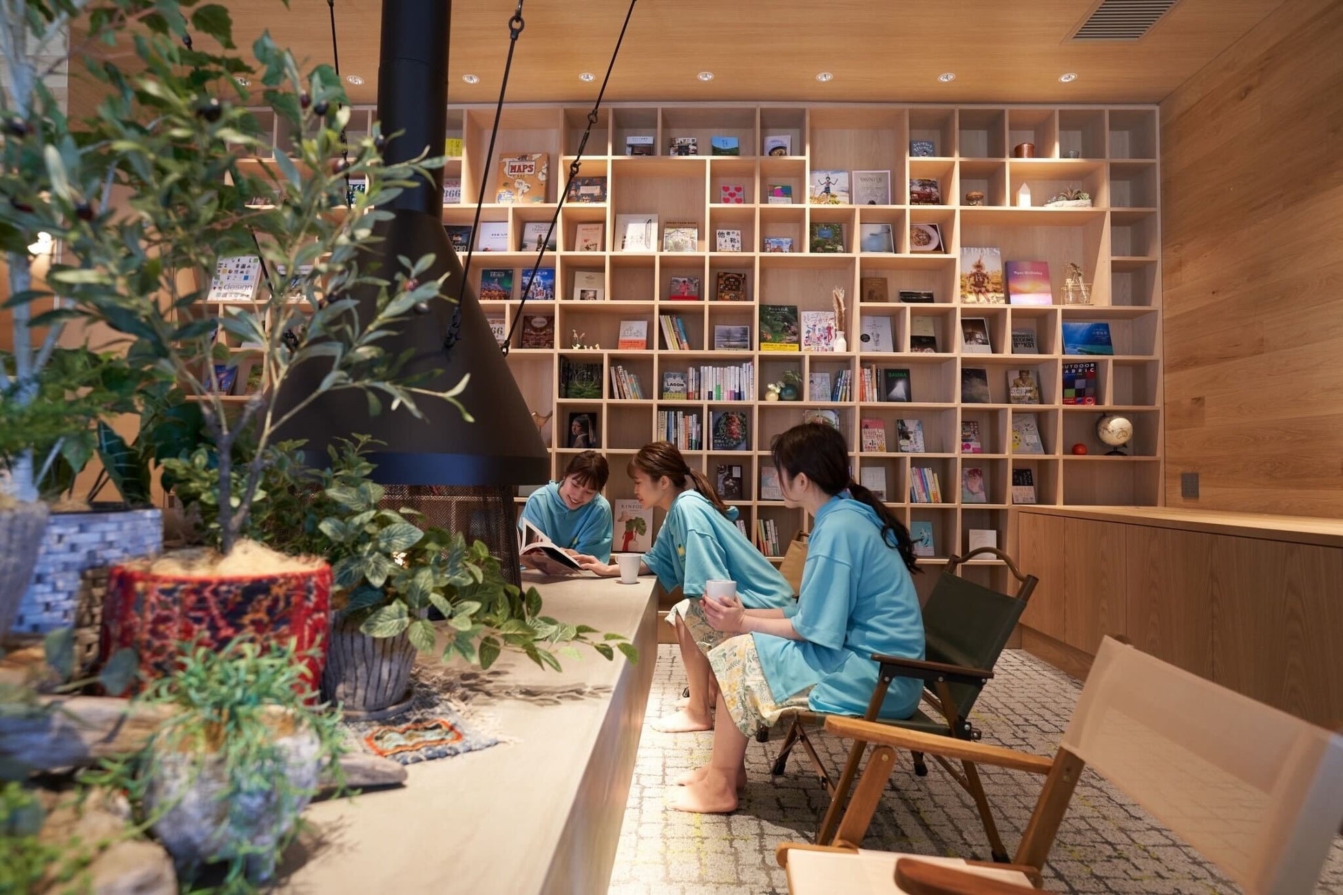 男女、そして大人と子どもが一緒にくつろげるサウナガーデン。水着で入るオートロウリュ付きの大規模サウナ室、ととのいを加速する広々テラスの外気浴ゾーンを備えています。テラス中央には子供たちに大人気の「ふわふわドーム」を配置。
